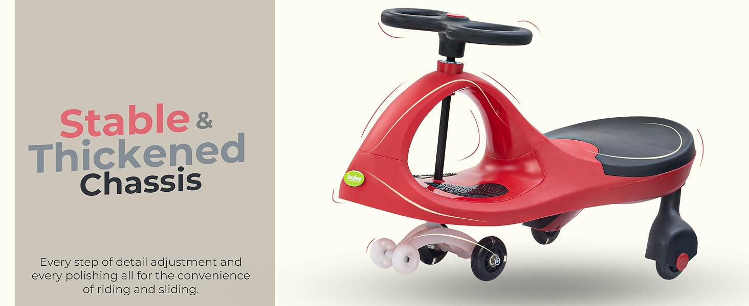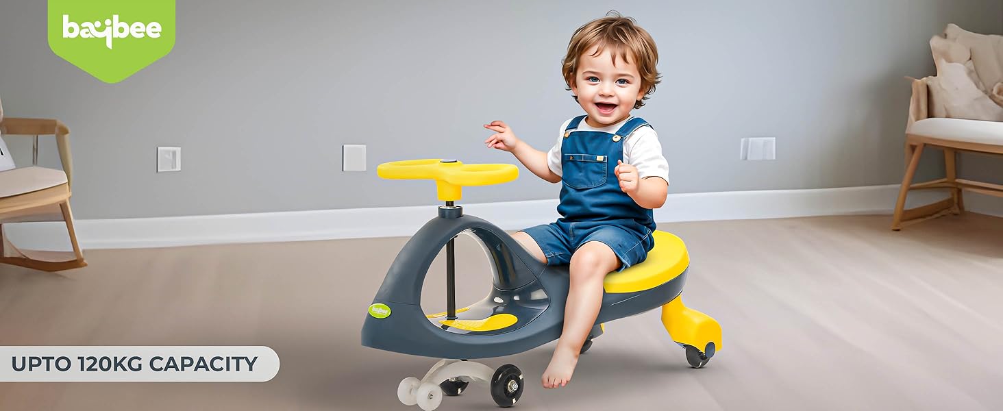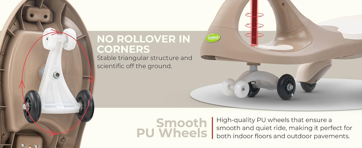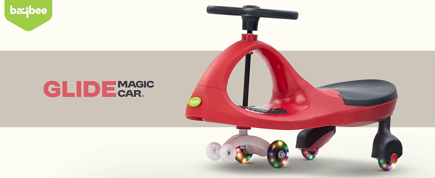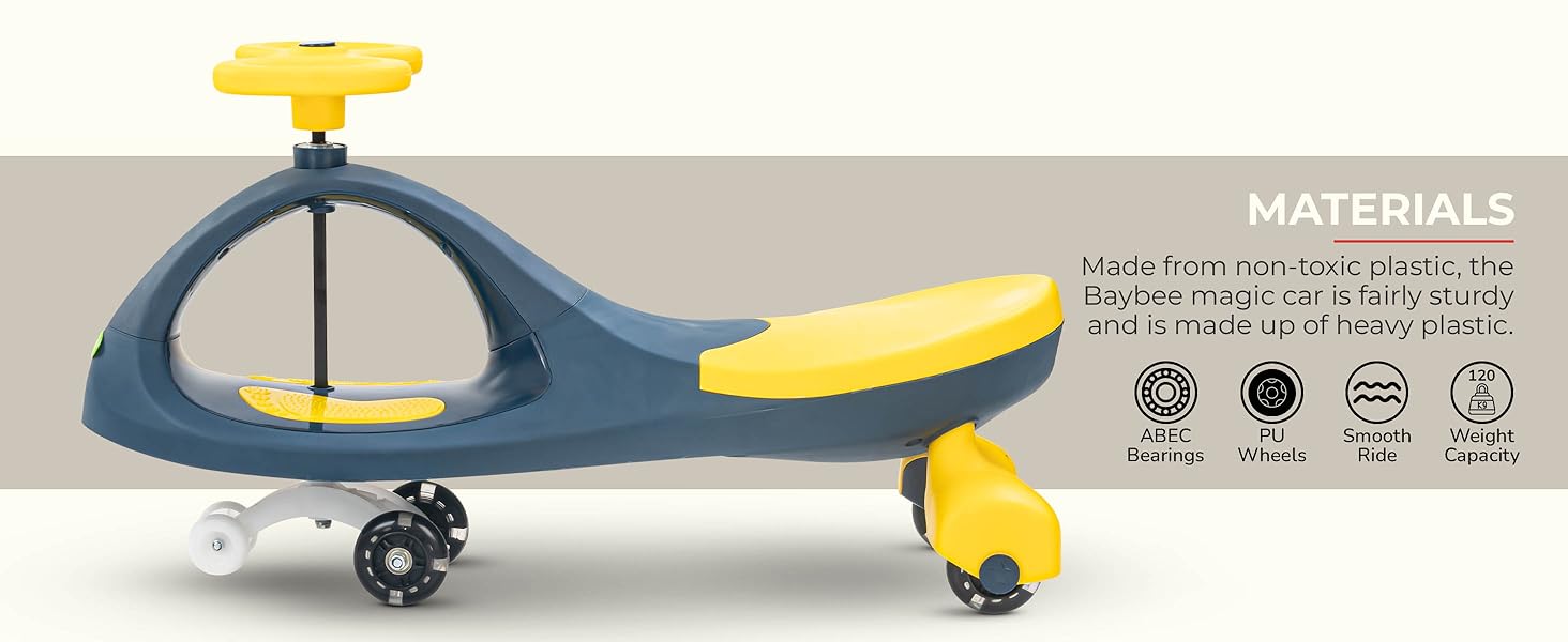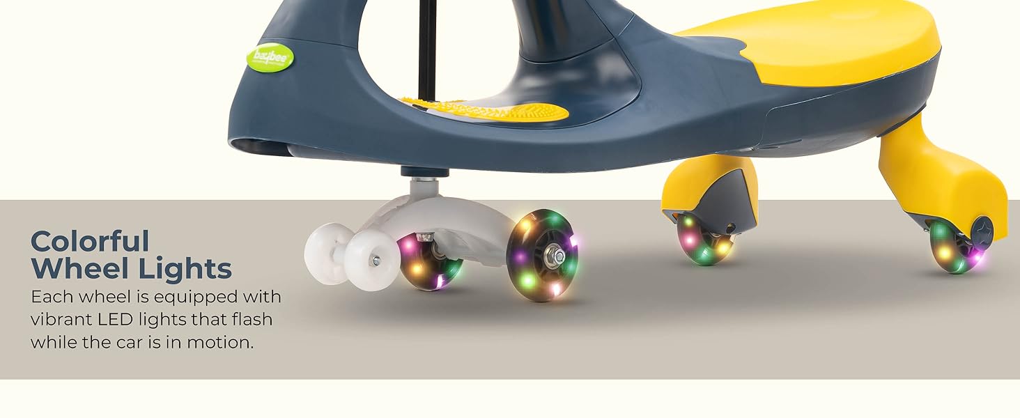 - Effortless Operation with Flashing LED PU Wheels – The Baybee Glide Ride-on Musical Magic Swing Car for Kids, Baby Car, and Children Car features smooth PU wheels and a cool steering wheel with eye-catching RGB flashing LED PU wheels. These stylish wheels not only enhance the kids' car's appearance but also improve the driving experience, making every ride more fun and exciting.