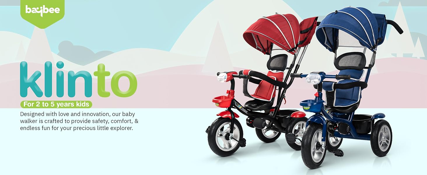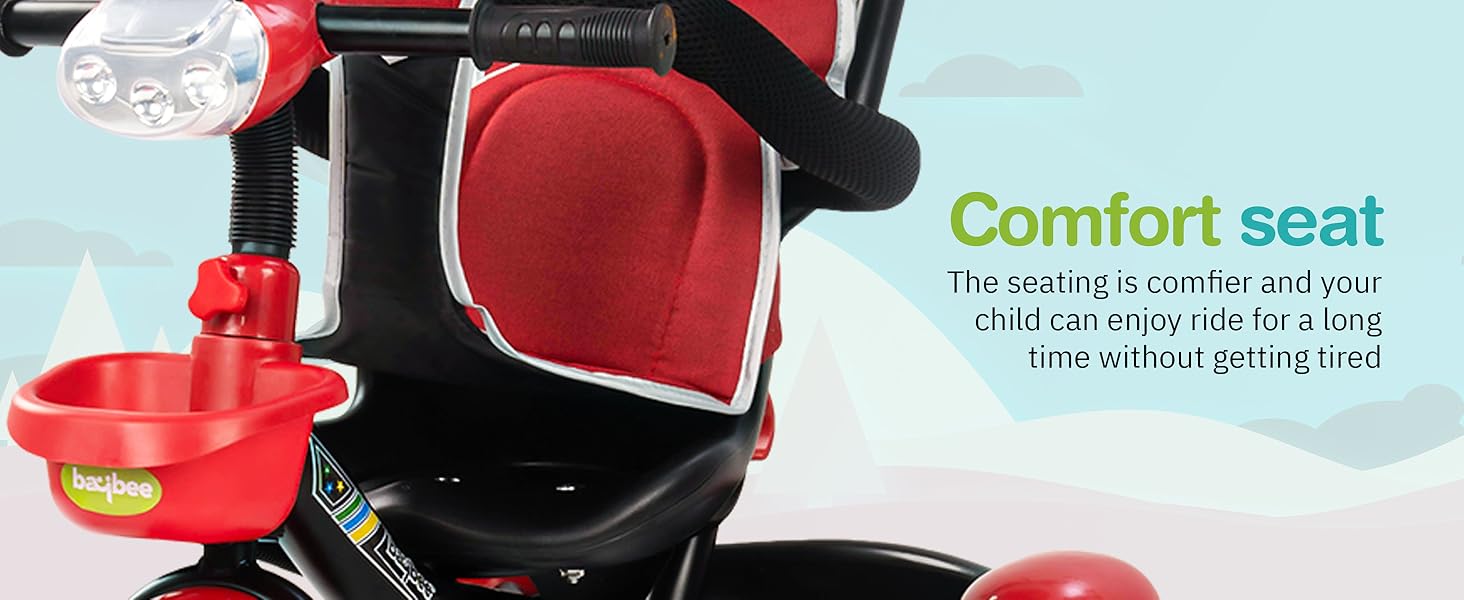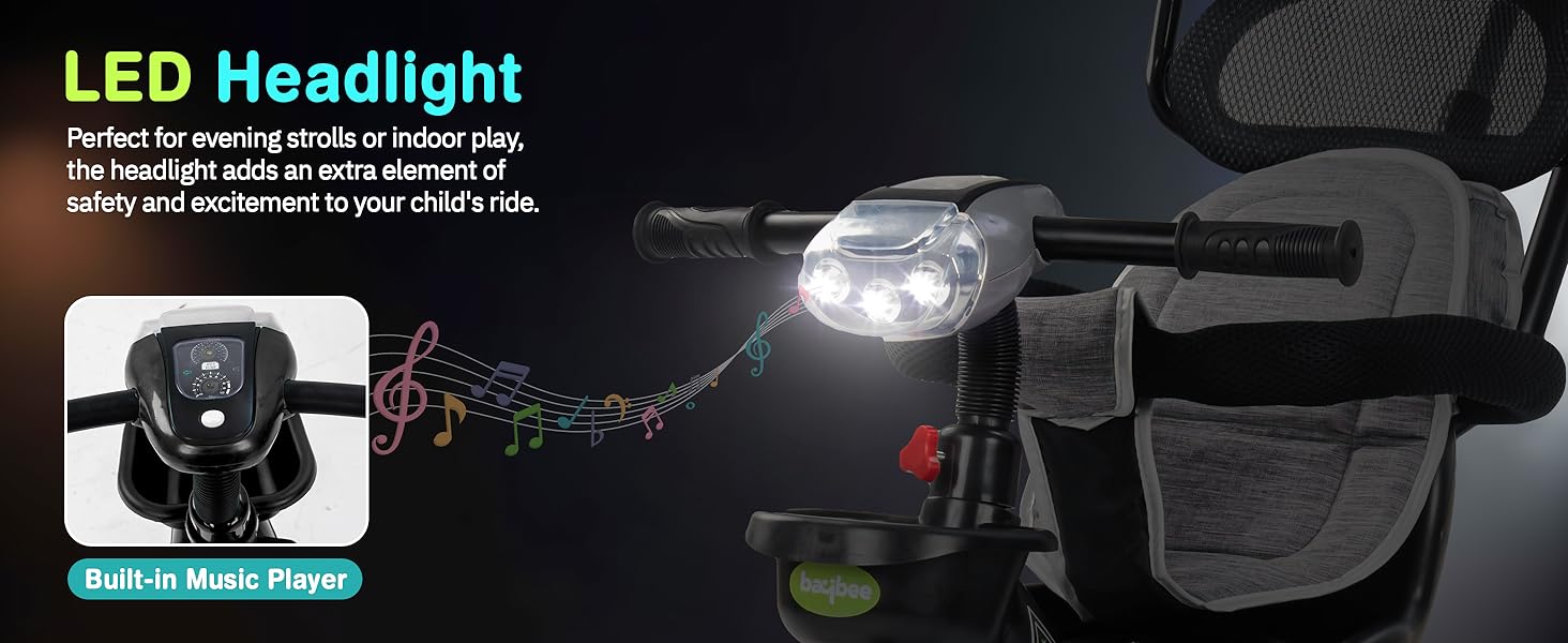 - Interactive and Fun Accessories: Equipped with a built-in LED headlight and music features, the Baybee Klinto trike offers an engaging and entertaining experience for children. These interactive elements encourage sensory development and make every ride a fun adventure.