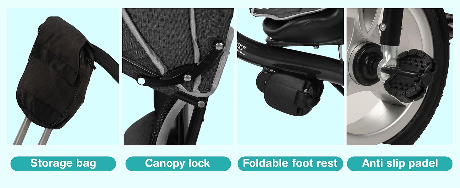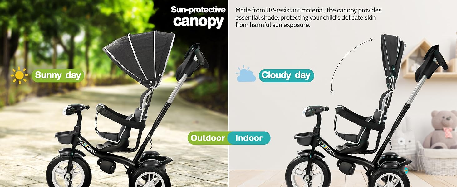- Enhanced Safety Features: This tricycle includes a removable canopy to protect your child from the sun, and a cushioned seat that supports proper posture and comfort. The robust rubber wheels provide stability and smooth movement across various terrains, making it safe for little riders. Additionally, the safety guardrail adds an extra layer of security.