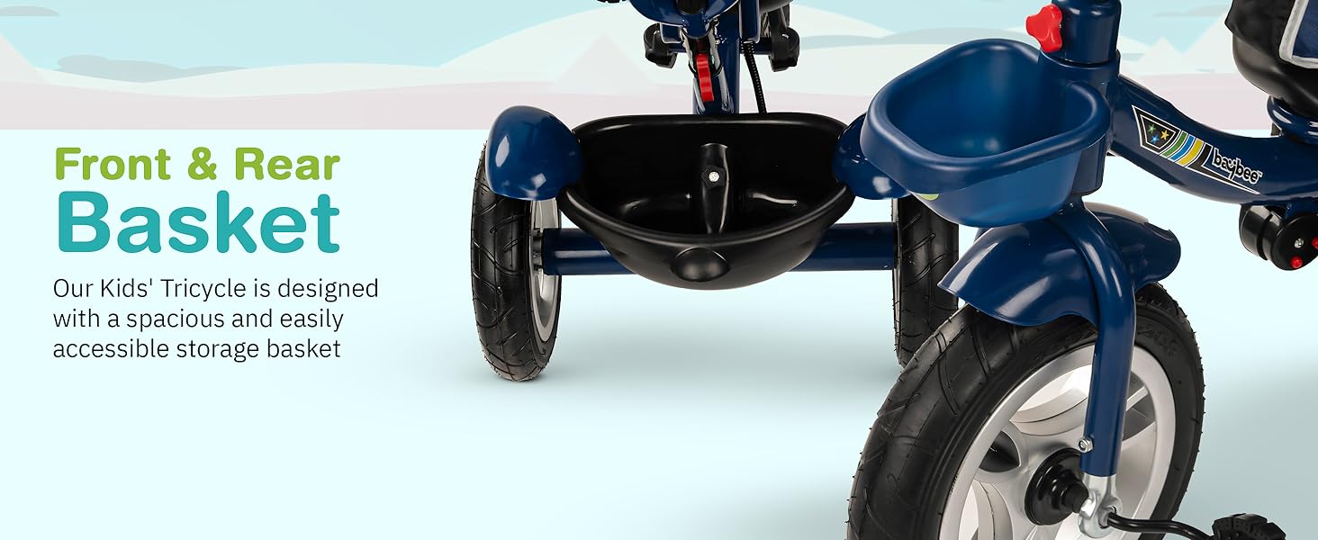 - Convenient Storage Solutions: Featuring both rear and front storage baskets, this tricycle offers ample space to store your child’s essentials, such as toys, snacks, and drinks. This makes it perfect for outings, ensuring that everything your child needs is always within reach.