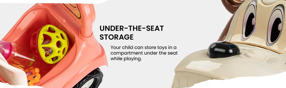 - In-built storage capacity – The hidden storage space under the seat ensures that your little one can load his snacks, toys, story books and other miniatures while driving around the neighbourhood.