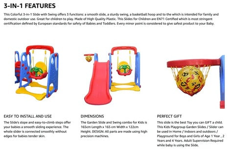 - MATERIAL: Made of High-Quality Plastic. This Slides for Children are EN71 Certified which is the most stringent certification defined by European standards for the safety of Babies and Toddlers. Every minor point is considered to give the safest product to your Baby.
