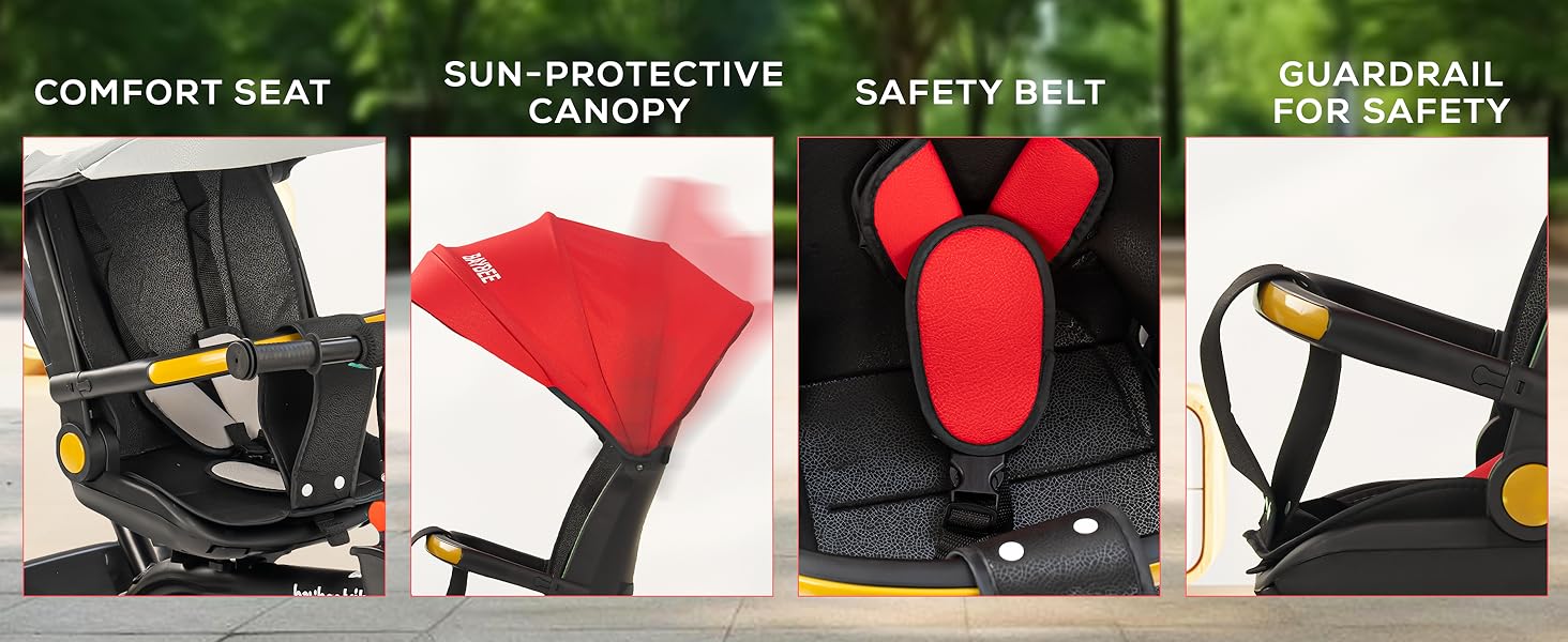 - 🚴🏾【Enhanced Comfort and Protection】: Featuring a canopy to shield your child from harsh sunlight or light rain, the Baybee Uno ensures optimal comfort during outdoor rides. Additionally, the safety guardrail provides extra security, preventing accidental falls and ensuring your child's safety throughout the journey. Enjoy worry-free outings with your little one, knowing they're snug and secure in their Baybee Uno.