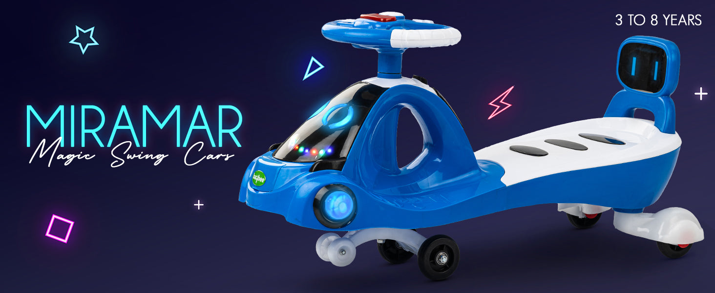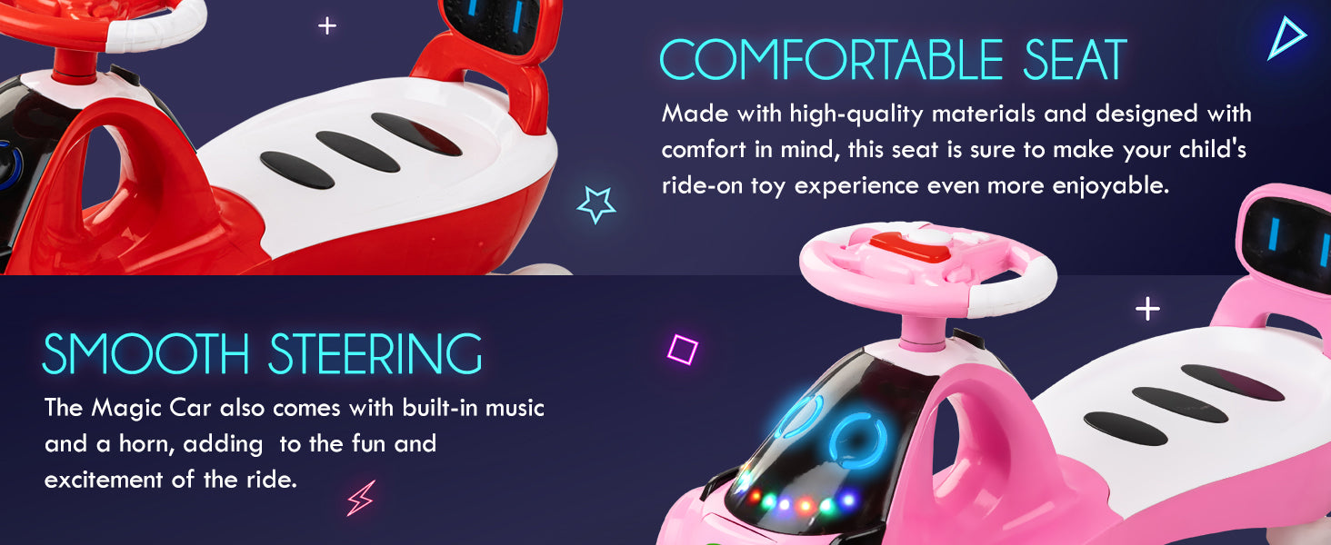 - Ride On Magic Car: The Baybee Ride on Magic Swing Car for kids come with stylish look, effortless operation with no gears, PP wheels, Steering Wheels, Music and Flashing LED Light, in addition to the thrill of driving this ride on toy car, your baby car will be able to develop and refine gross motor skills like balancing, coordination, and steering! It also encourages kids to be active and independent.
