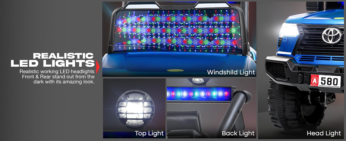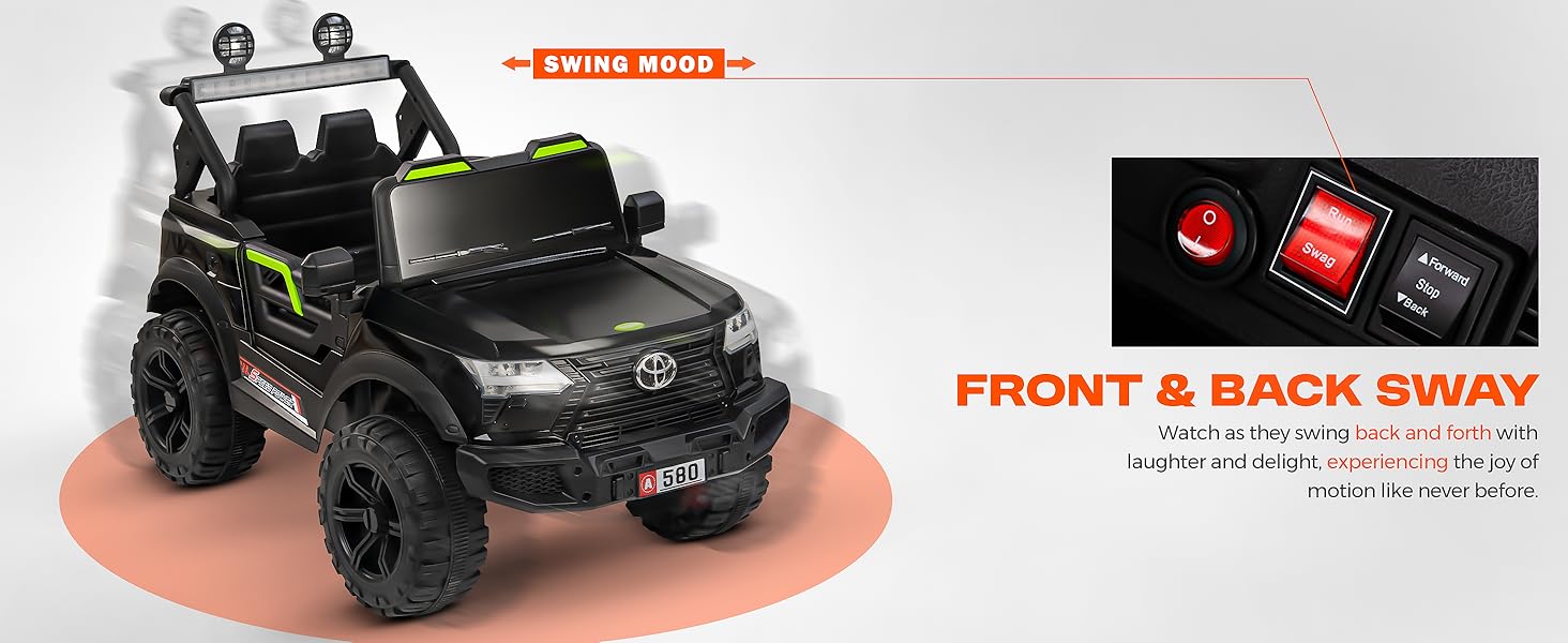 - 🔒 Enhanced Safety Features: With a strong 4*4 motor and a gentle start function, the jeep ensures a safe driving experience. It also includes bright LED lights for improved visibility in low light conditions and a smart steering system to prevent tipping, creating a secure setting for young explorers.