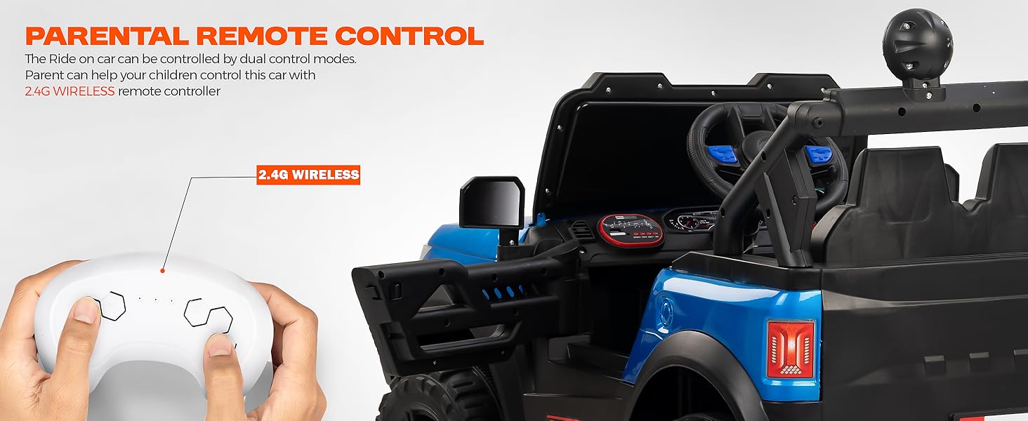- 🚀 Dual Control Electric Jeep: The Baybee Rampage Electric Battery Operated Jeep comes equipped with dual control systems, enabling both parents and children to guide the vehicle. A 2.4G wireless remote 🎮 allows parents to safely oversee the drive, while children can engage directly with the controls, enhancing skills like coordination, courage, and self-reliance as they manage the accelerator, steering, and overall movement.