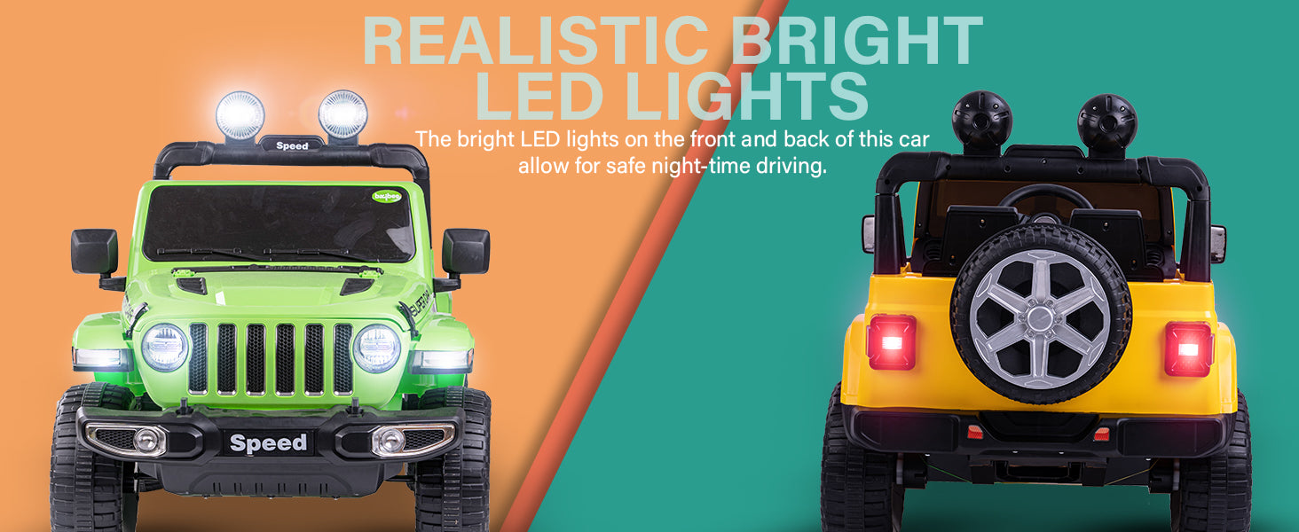 - π [Safe to Drive] - Powerful engine with a slow start for safer use. The bright LED lights on the front of this car allow for safe nighttime driving. The steering wheel can only slightly change the direction of the car, which helps prevent accidental overturning
