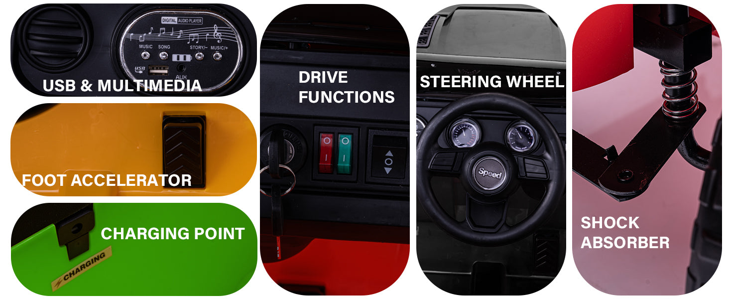 - π [Realistic Car Design] Electric Car gives your kids a realistic driving experience just like a real vehicle with a horn, led Headlights, music, USB, Aux, remote controller. You can connect a USB port or Aux and play a wider selection of songs and stories. The volume control buttons, Music buttons, record, play buttons &battery charge display, The charging hole is hidden to prevent water from entering it and to enhance the toyβs aesthetics
