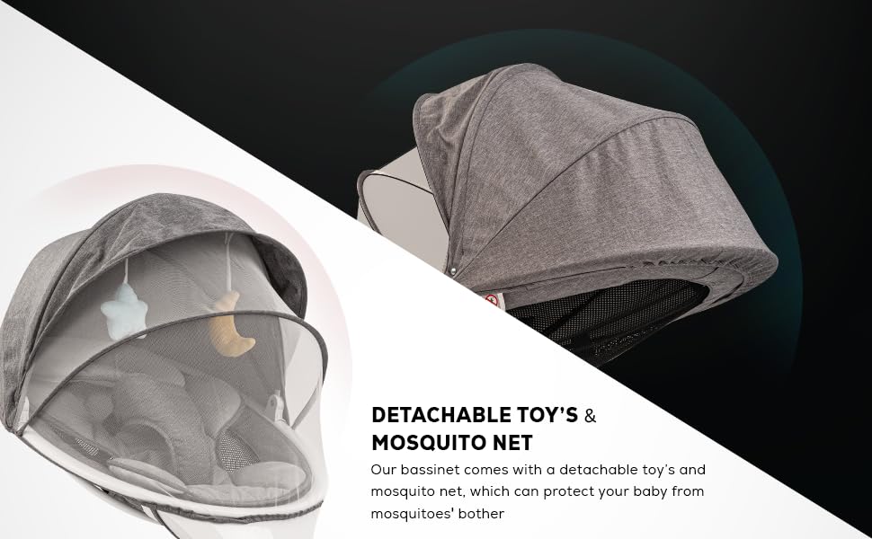 - Removable Mosquito Net: Toys & Inbuilt Music: It comes with mosquito net for baby safety and it is easy to remove .The stuffed toys train babies how to touch and grab things. the inbuilt soft 8 melodies can be played at will comfort babies with moms playing around the swing. music volume control can be set with a remote controller.