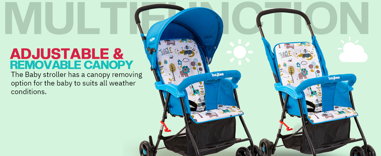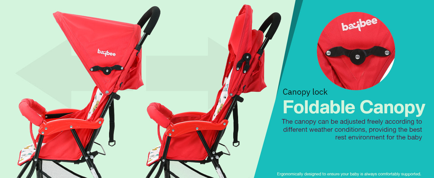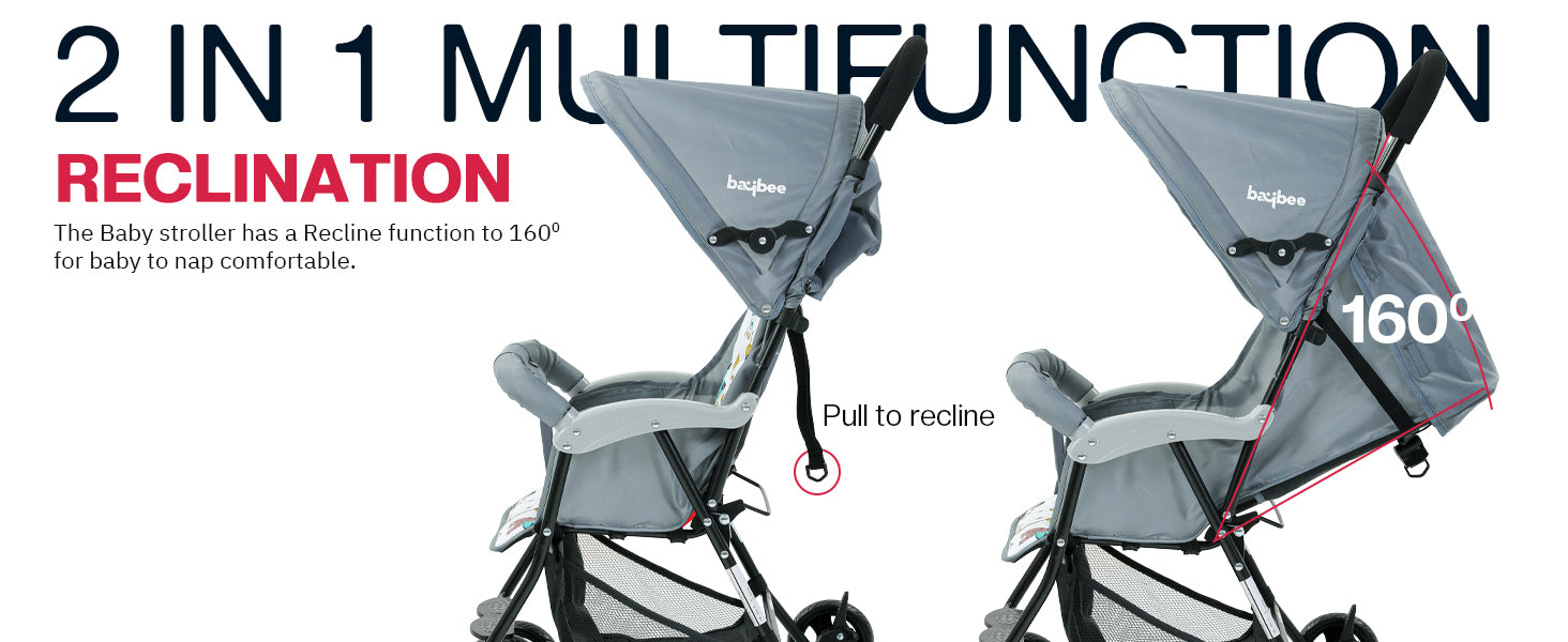 - [Adjustable Backrest & Canopy] : The backrest of the baby stroller can be reclined from 100° to 160° for sitting, lying, or sleeping. You can also make a corresponding adjustment to the footrest for the most comfortable position. What’s more, the canopy can be adjusted freely according to different weather conditions, providing the best rest environment for the baby.