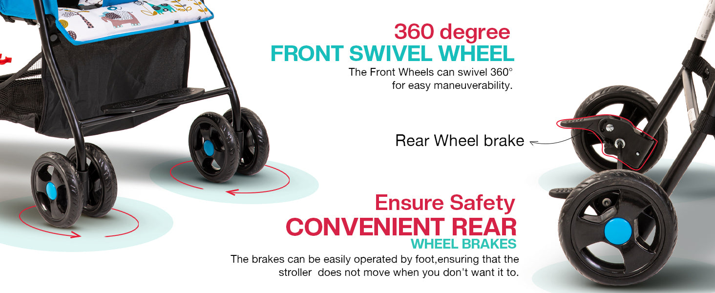 - 【Strong & Durable Wheels】:The Infant Stroller comes with double front wheels and dual single back wheels, that make it easy to glide over bumps in the road, creating an effortlessly smooth ride. The linked brakes lock both rear wheels by pressing a single pedal. Unlock the wheels for easy